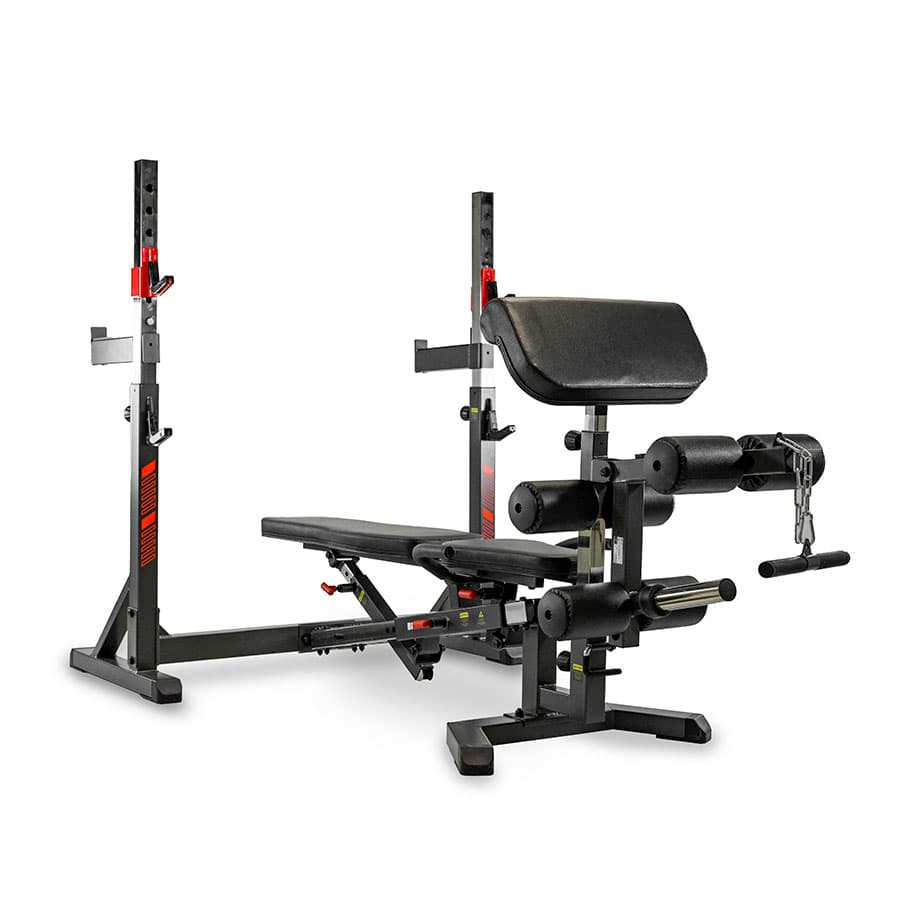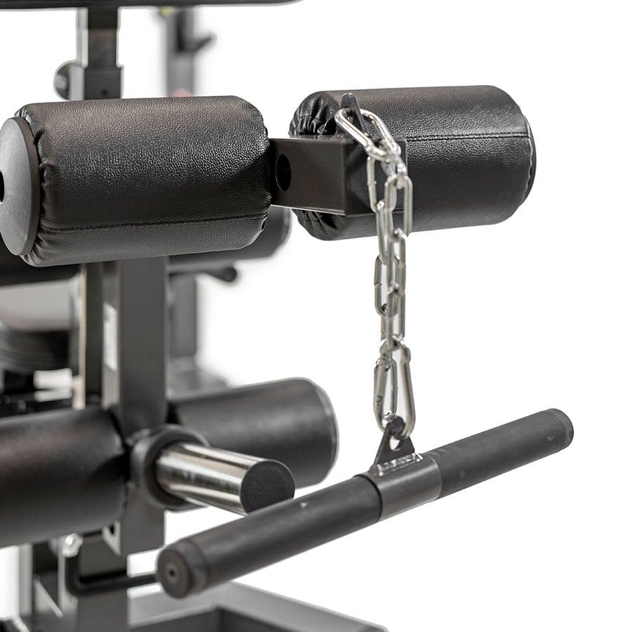 Este accesorio, compatible con el banco Olympic Rack G510, se fija de manera sencilla al banco G510 y es perfecto para un entrenamiento integral de la parte superior e inferior del cuerpo. El extensor de piernas está diseñado para fortalecer los cuádriceps y los isquiotibiales a través de ejercicios de curl y extensión, además de permitir el trabajo de bíceps mientras se está sentado.
