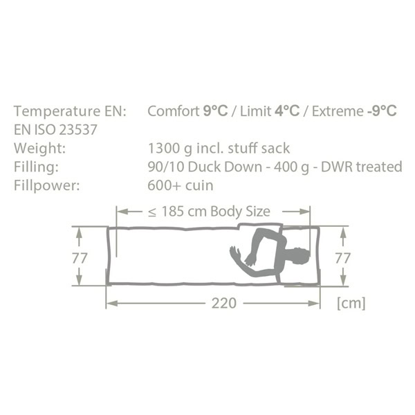 Forma de corte de manta para una confortable libertad de las piernas – cremallera perimetral (para utilizar el saco como manta) – se adapta a la ropa de cama habitual (155 x 220 cm) – Se puede acoplar con todos los sacos de dormir rectangulares de VAUDE para formar un cómodo saco de dormir para dos personas. – muchas posibilidades de combinación gracias al acoplamiento – bolsillo interior para guardar utensilios – La segunda cremallera permite usar ambos brazos para cocinar, leer, … mientras se está sentado dentro del saco de dormir. – parte superior plegable para mantener libre la zona de la cabeza – en combinación con una almohada también ideal para personas grandes – materiales especialmente suaves y agradables para la piel según el estándar bluesign® – Material con recubrimiento impermeabilizado libre de PFC – Nikwax Hydrophobic Down Plus – plumón con equipamiento hidrófugo – Funda de compresión incluida