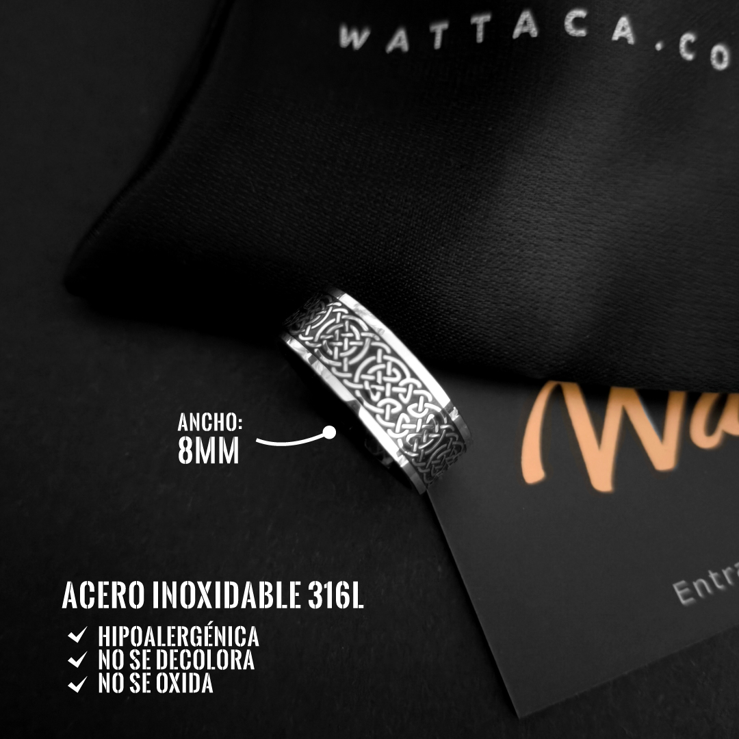 Inspirado en los antiguos nudos celtas, este anillo simboliza la conexión eterna, el equilibrio y la protección espiritual. Su diseño entrelazado no tiene principio ni fin, representando la eternidad del alma y los lazos que no se rompen.