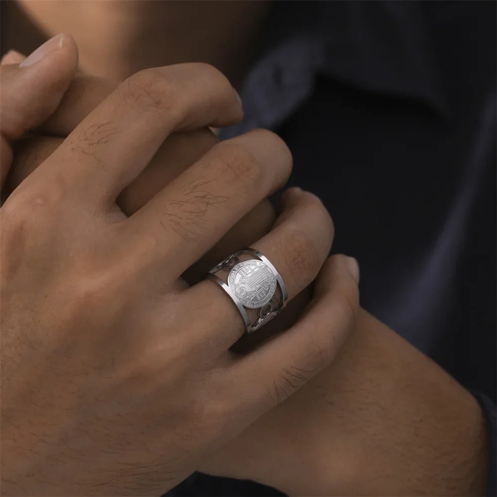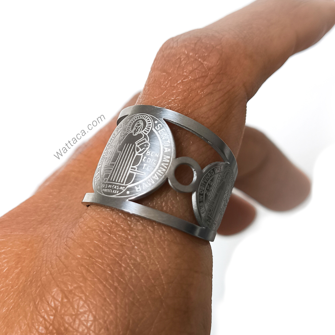 Este anillo combina elegancia y significado, llevando grabado de San Benito, reconocido por ser un símbolo protector frente al mal y las energías negativas. Diseñado para mujeres que valoran la fuerza espiritual y el diseño sofisticado.