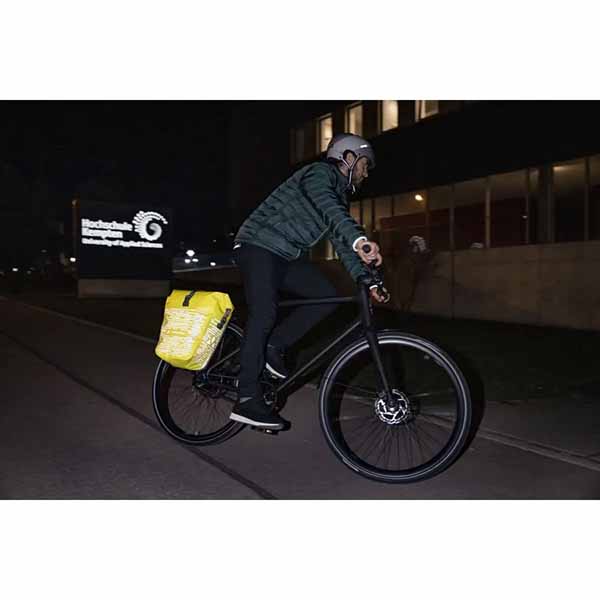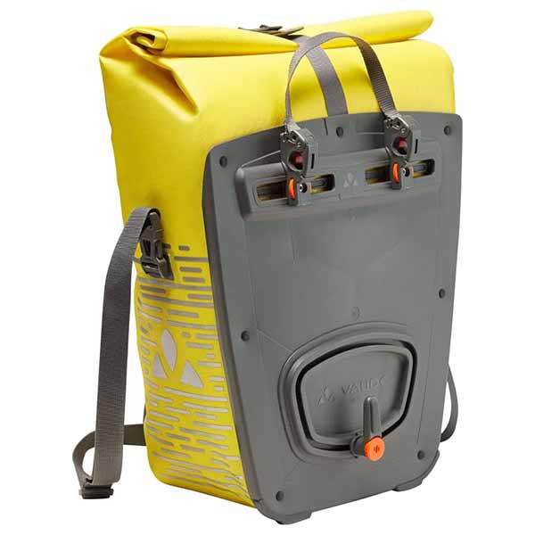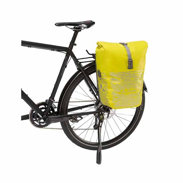 ¡Para quienes se desplazan al trabajo, en ocasiones en la oscuridad! La alforja trasera impermeable con una gran impresión muy reflectante se fabrica en un robusto material de lona sin PVC en la sede alemana de VAUDE, cerca del lago de Constanza, en un procedimiento de soldadura de alta frecuencia. Gracias al cierre enrollable se puede ajustar el tamaño deseado y cerrar herméticamente. Una bolsa interior con pequeños bolsillos de red aplicados con cremallera aporta orden. La bolsa para bicicleta se fija con el sistema QMR 2.0 y una estable placa trasera al portaequipajes trasero. Tirando de la cinta que conecta ambos ganchos se abre cómodamente el sistema. El sistema, bloqueable con un pequeño candado (p. ej., Abus 145/10, no incluido) se ajusta fácilmente con ruedecillas y se completa con el Rail Hook inferior, de ajuste flexible. Una práctica correa de bandolera facilita el transporte a pie. Para quienes van o vienen del trabajo en la penumbra o la oscuridad, esta bolsa reflectante para bicicleta es imprescindible para los trayectos diarios al trabajo.La bolsa para bicicleta Aqua Back Luminum se puede complementar con estos prácticos accesorios: Sortyour Business, Sortyour Back, Addita Bag. Contenido: 1 bolsa