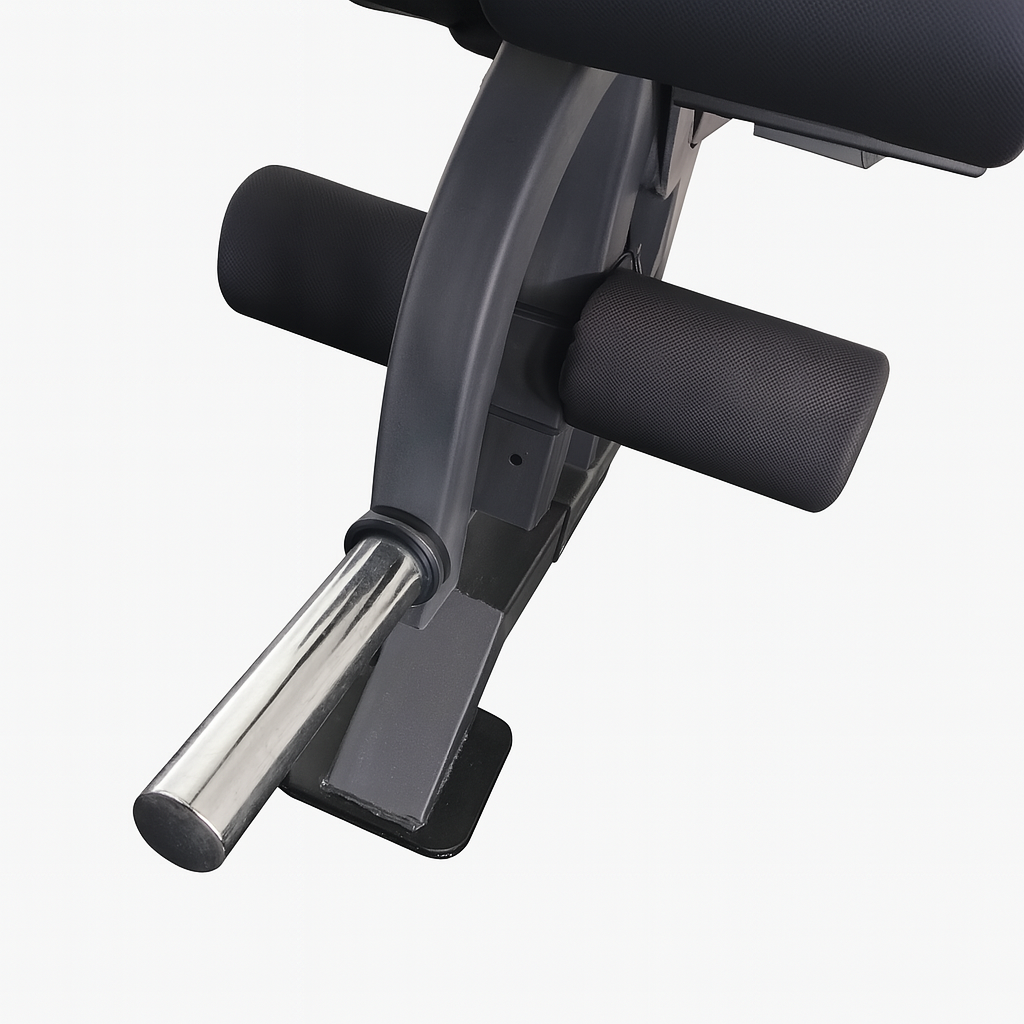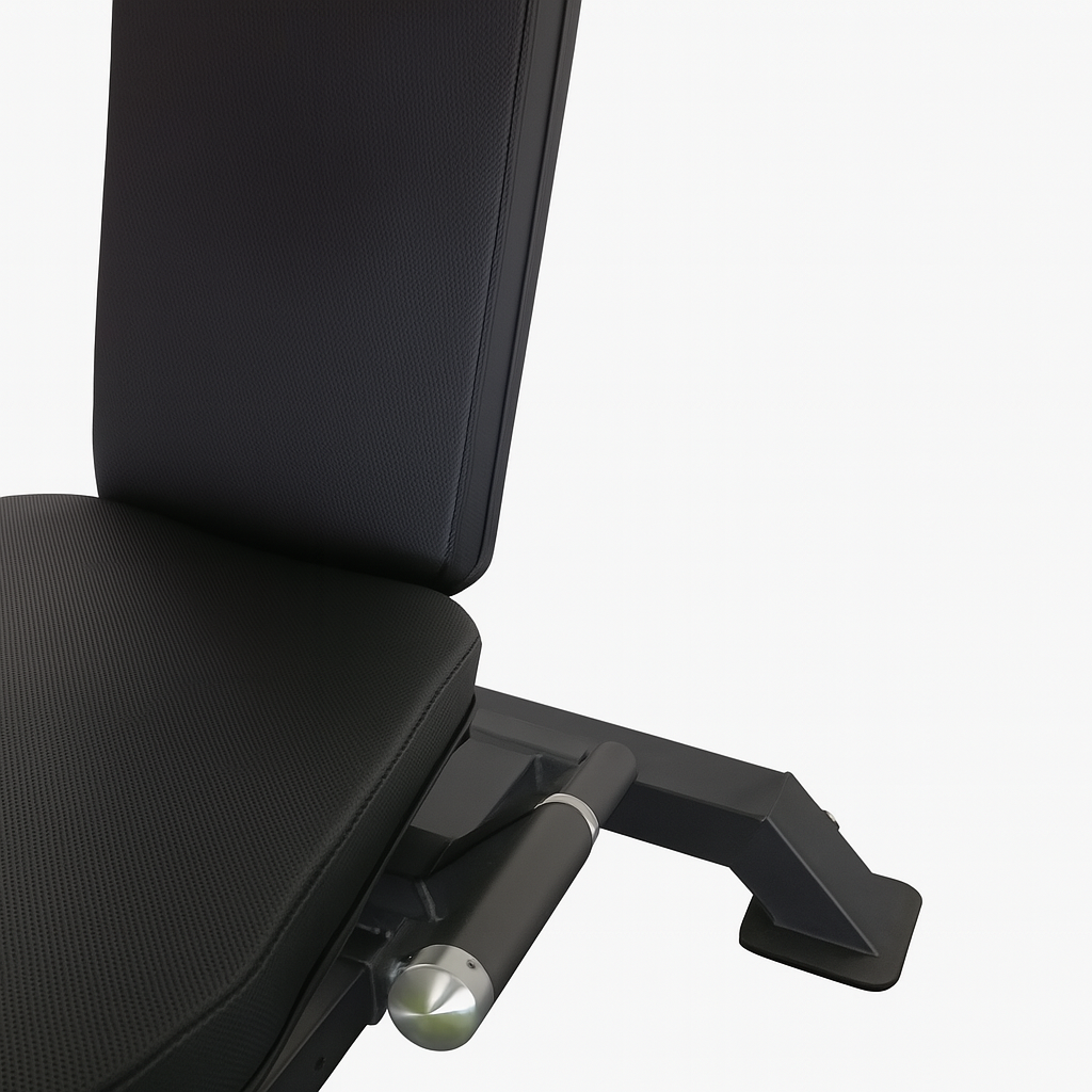 El banco permite ajustar el respaldo, el ángulo de las almohadillas y la posición de trabajo, adaptándose a distintas alturas y niveles de experiencia del usuario.
