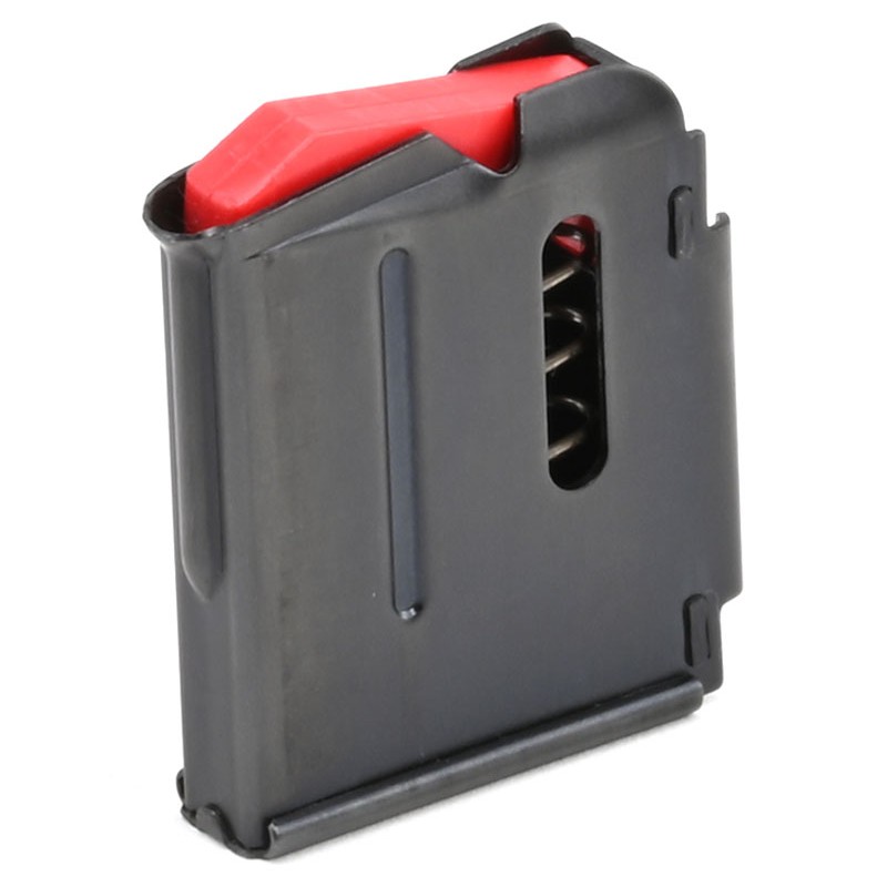 Cargador metálico negro de acero con capacidad para 5 cartuchos.