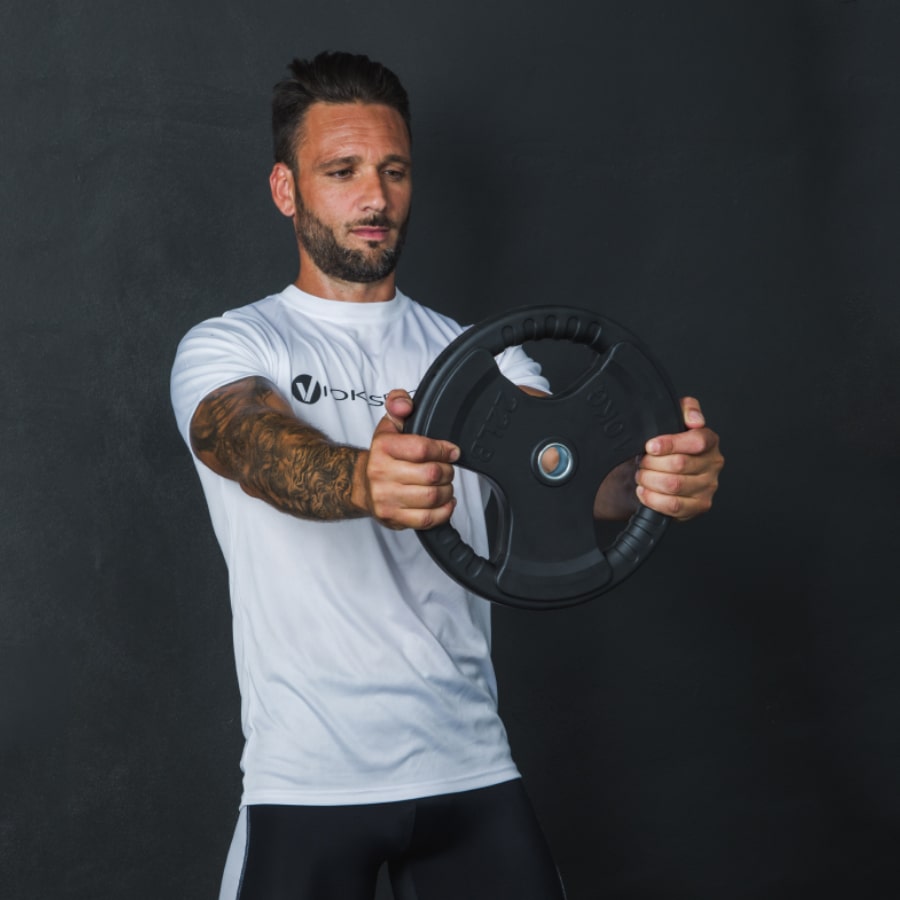 Las opciones de uso de estos discos, combinados con una barra de 30 o 28 mm, son muy diversas: sentadillas, cargadas, remos, press de banca, press de hombros y mucho más. Además, gracias a su excelente agarre, también puedes utilizarlos de forma independiente como mancuernas, para ejercicios como aperturas de hombros, patadas de tríceps, curl de bíceps o remo a una o dos manos.[/vc_column_text][vc_row_inner][vc_column_inner width=”1/3″][vc_empty_space height=”15px”][vc_single_image image=”7129″ img_size=”full” alignment=”center”][vc_column_text]