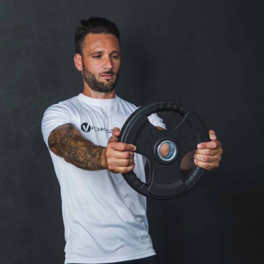Las posibilidades de uso de estos discos combinados con barra olímpica son muchísimas: sentadillas, cargadas, remos, press de banca, press de hombros y un largo etecétera. Y no solamente eso, sino que gracias a su agarre, podrás usarlos de forma independiente a modo de mancuerna, practicando movimientos como apertura de hombros, patadas de tríceps, curl de biceps, remo a una o dos manos.[/vc_column_text][vc_row_inner][vc_column_inner width=”1/4″][vc_empty_space height=”15px”][vc_single_image image=”7129″ img_size=”full” alignment=”center”][vc_column_text]