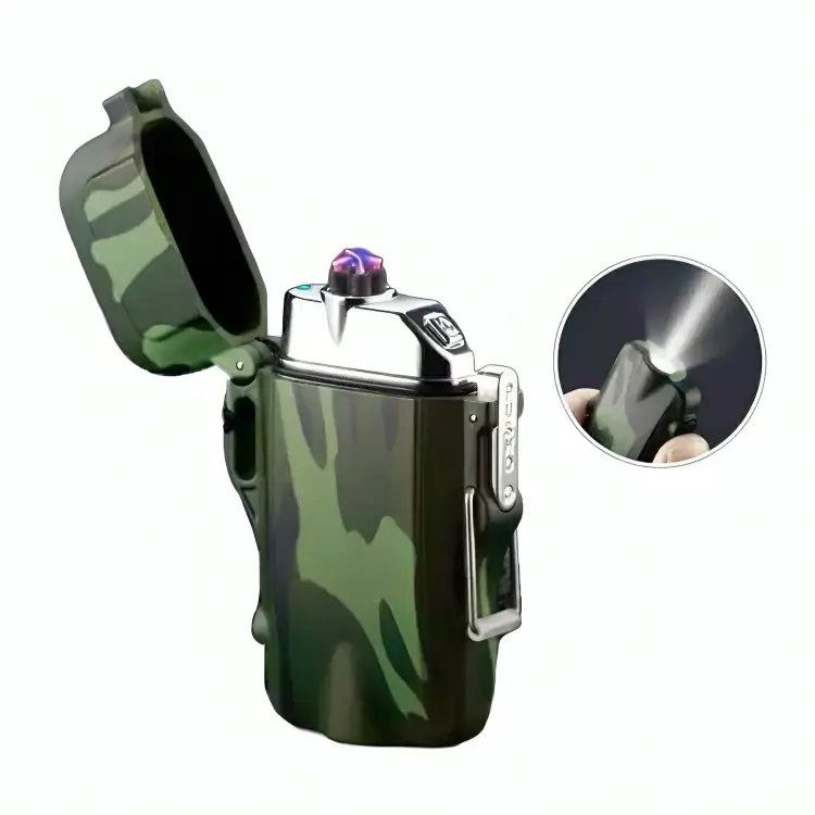 Cuenta con encendido de arco eléctrico sin llama, resistencia al viento y una linterna integrada de tres modos (bajo, alto y destello), ideal para emergencias y exploraciones nocturnas.