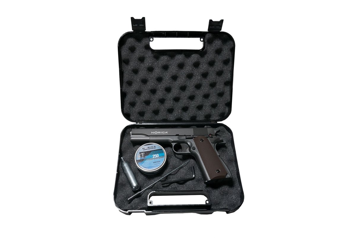 Réplica del modelo 1911. El modelo 1911, diseñado por J.M. Browning, está considerada la pistola más pòpular del mundo y Norica la quiere entre su gama de pistolas. Manteniendo la estética y la funciones de seguridad del modelo original, la N.A.C. 1911 dispara balines Match cal. 4,5 por su cañón de precisión estriado fabricado en Alemania. Accionado por una cápsula de CO2 conseguimos una velocidad de 100 m/s por 60 disparos con una sola cápsula. El cargador rotatorio de 12 disparos (2 x 6) y la bombona de CO2 se alojan en el cargador. La pistola es de simple acción.