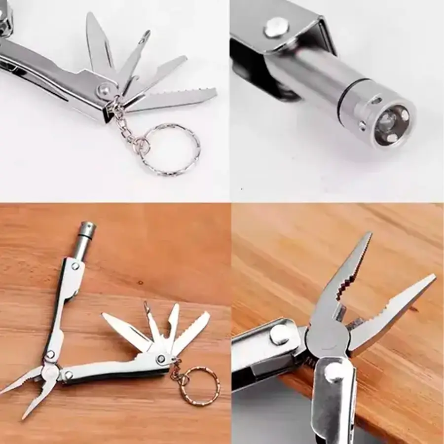 Alicate Multiusos: Con navaja, linterna LED, destornilladores (estrella/pala), sierra y destapador.
