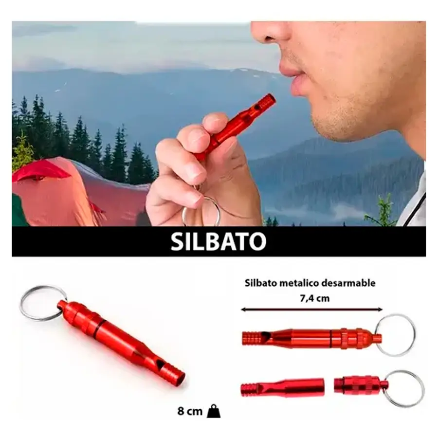 Silbato de Emergencia: Con compartimento estanco para fósforos o medicinas.