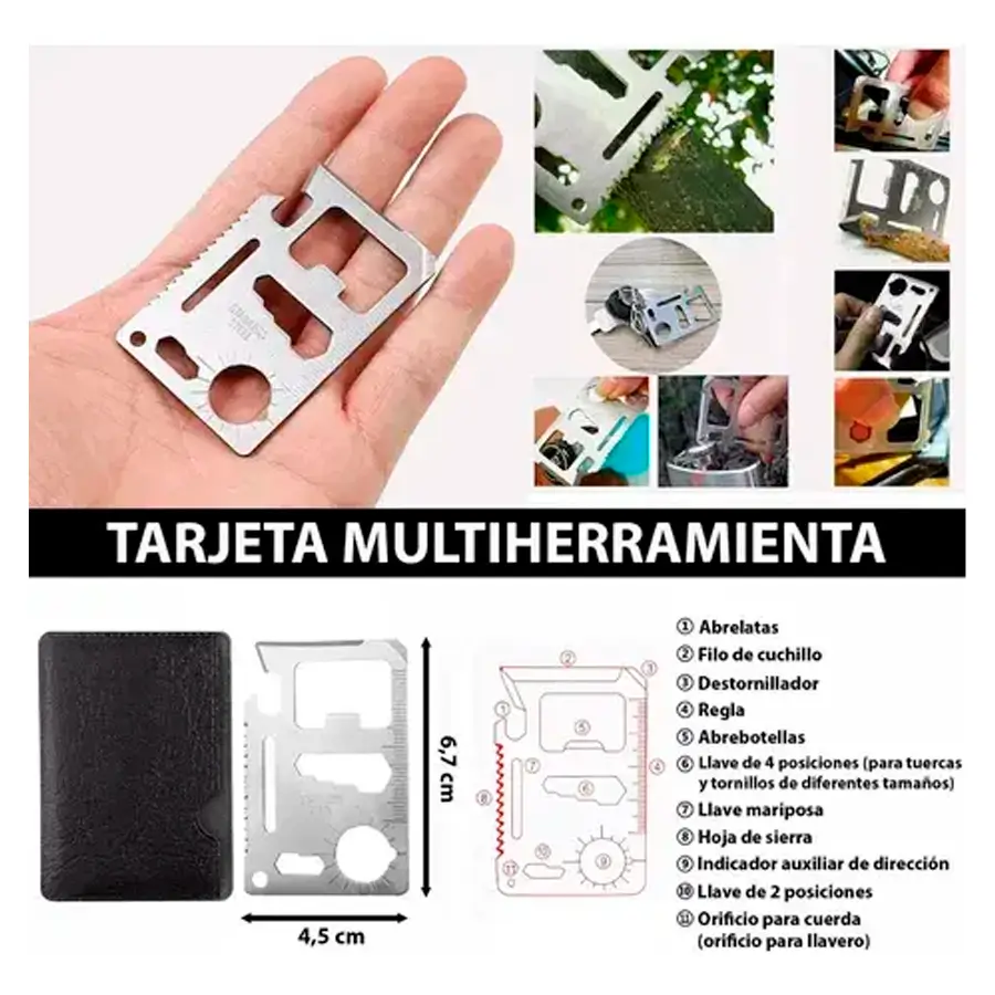 Tarjeta Ninja Wallet: 11 funciones (abrelatas, regla, llave de tuercas, sierra rígida, etc.).