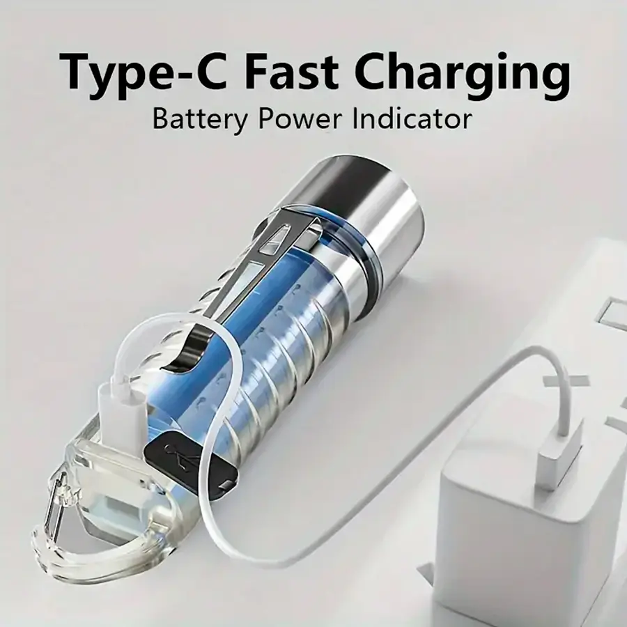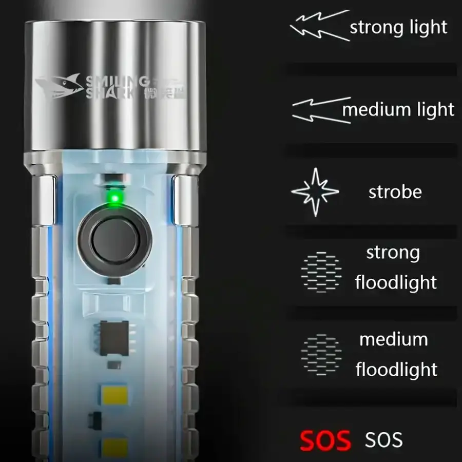 1pc Linterna de mano LED de tiburón sonriente, recargable por USB con 6 modos, alta luminosidad, Tipo-C, luz de bolsillo portátil con gancho, clip, advertencia roja y bolsa de almacenamiento para camping al aire libre, senderismo y emergencias.