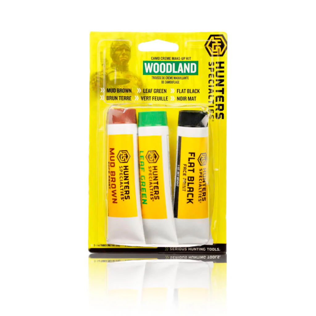 Mézclate con tu entorno con esta pintura facial de camuflaje fácil de usar. El kit incluye tres 1 oz. tubos de maquillaje en crema: marrón barro, negro plano y verde hoja, y es una excelente adición a su equipo de caza.