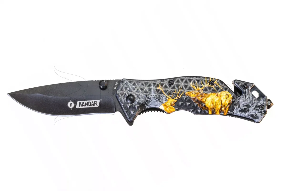 El práctico cuchillo de guardabosques Kandar N379 destaca por su hoja ergonómica decorada con un motivo de ciervos en un paisaje forestal. La superficie de la hoja está cubierta de protuberancias para proporcionar un agarre adecuado. Hay 8 tornillos torx situados por toda la superficie de la vaina, que fijan la vaina al armazón metálico, de debajo del cual sobresale el bloqueo del forro de la hoja.