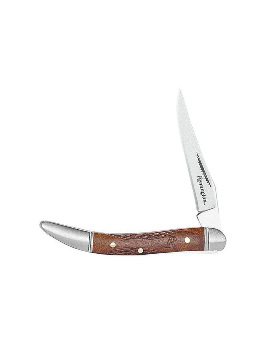 Las navajas Remington son meticulosamente elaboradas con materiales de alta calidad para garantizar una larga vida. La navajas de la serie Woodland de Remington cuenta con un mango de madera dura con picados y con el logotipo ‘R’ grabado. Es una navaja plegable y la hoja en punta es de acero inoxidable 440 con la inscripción Remington grabada.