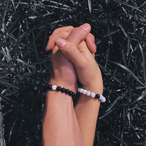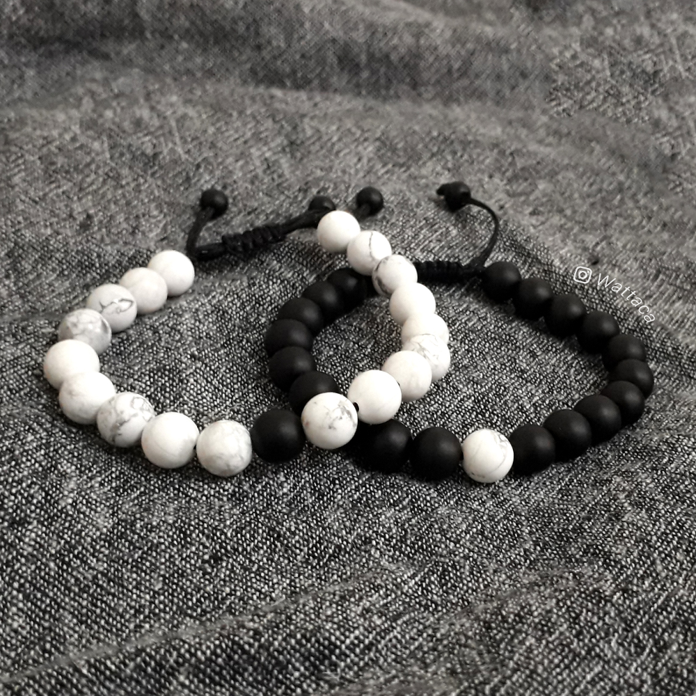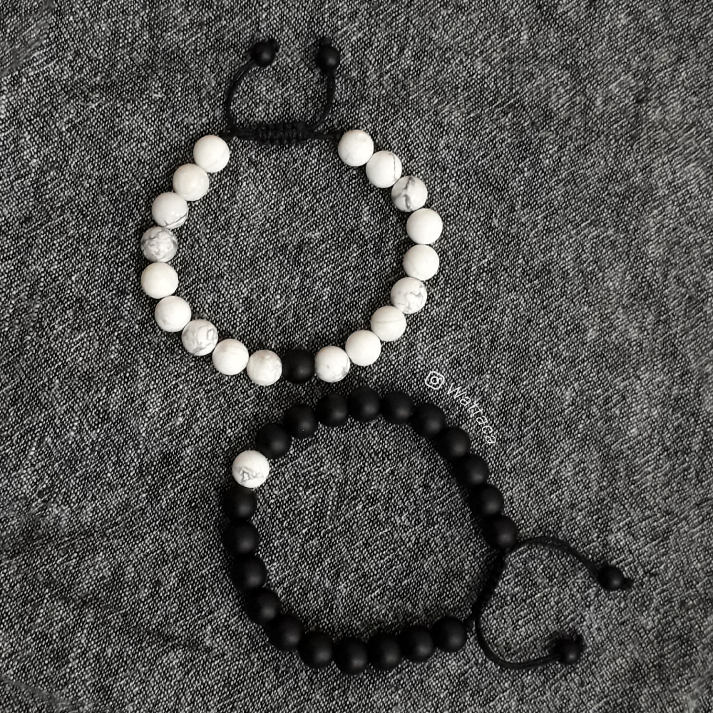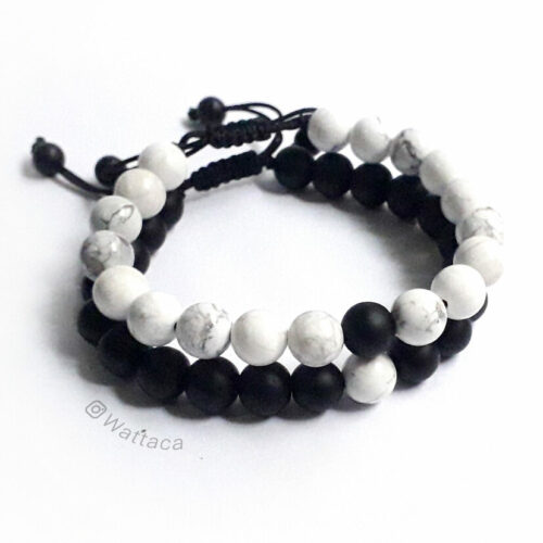 Pulseras para parejas Distancia, este pack está elaborado en piedras Onix Mate negro y Howlita blanca.