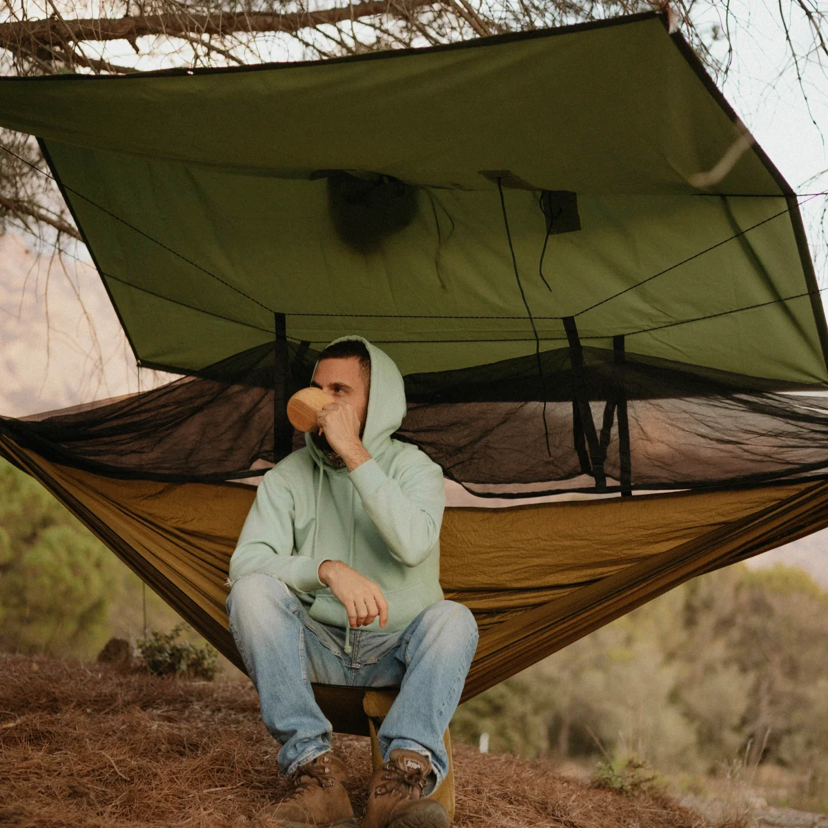 - Cuenta con 6 ojales donde se le pueden atar cuerdas para usarlo como tarp (toldo) y protegerte de la lluvia o dormir debajo haciendo vivac. Es ideal como complemento de la hamaca, para pasar la noche resguardado.