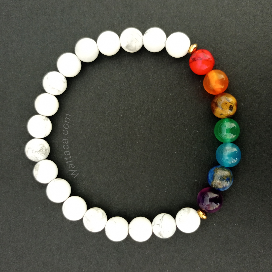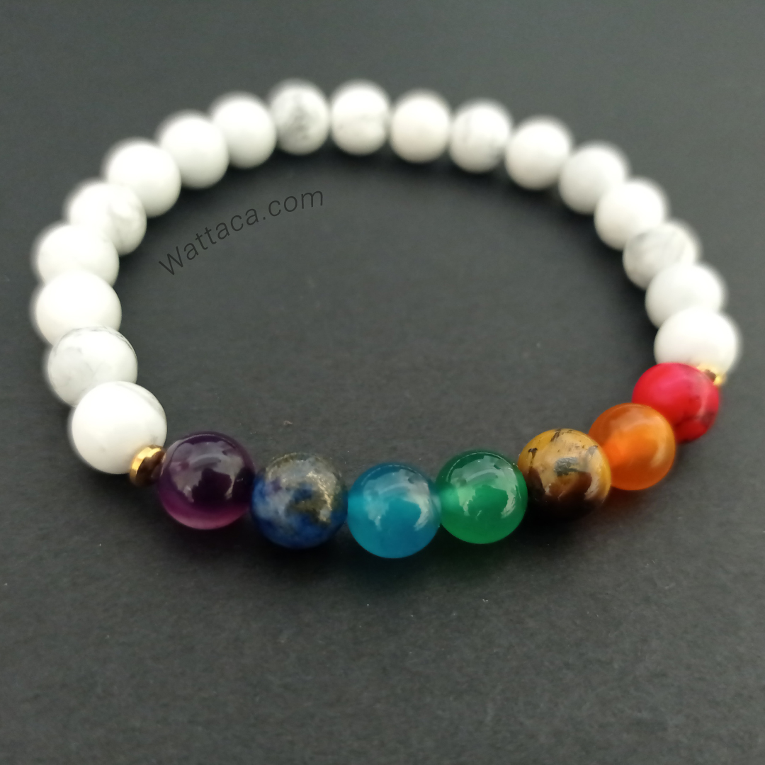 Pulsera 7 Chakras, elaborada en piedras Jaspes, Ágatas, howlita y aros de acero.