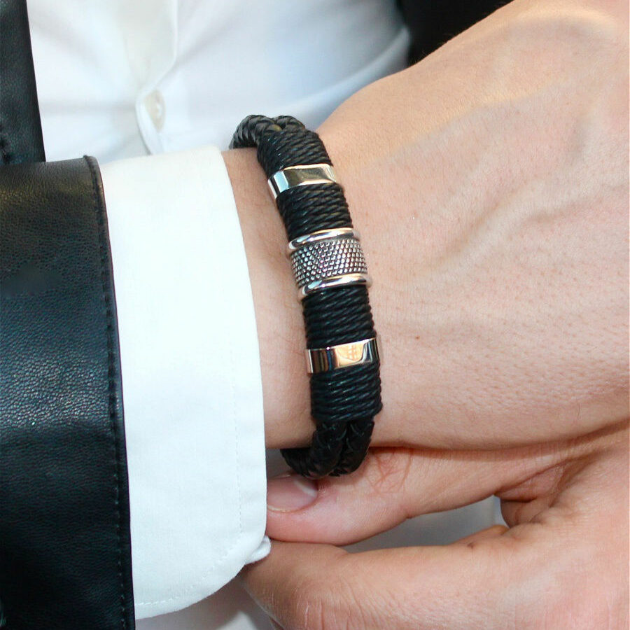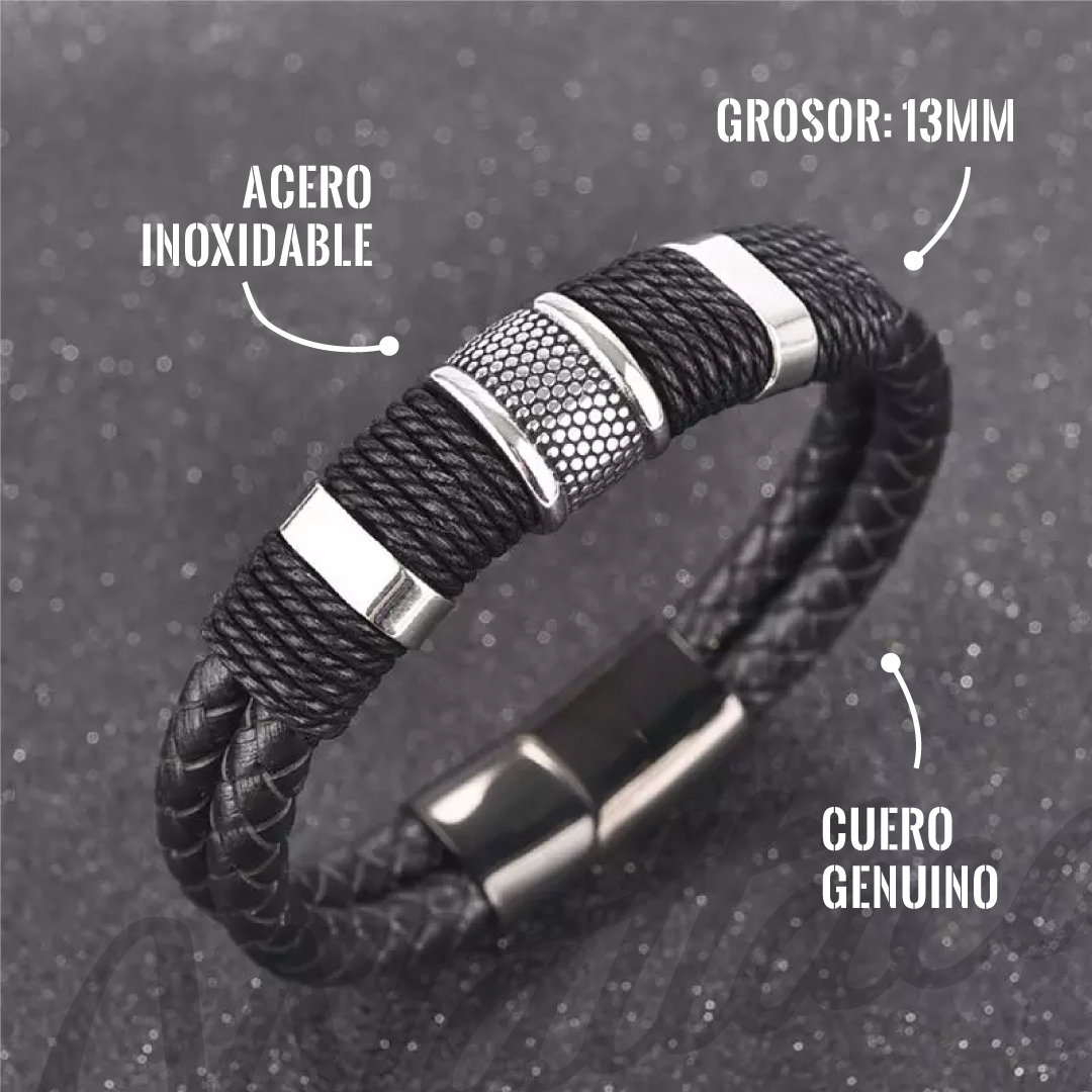 Pulsera de cuero de alta calidad, con piezas de acero inoxidable con un acabado elegante y sobrio.