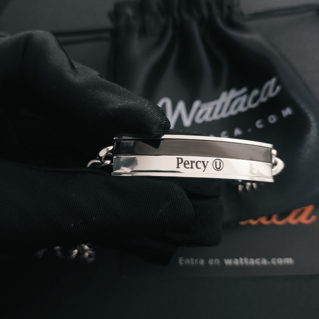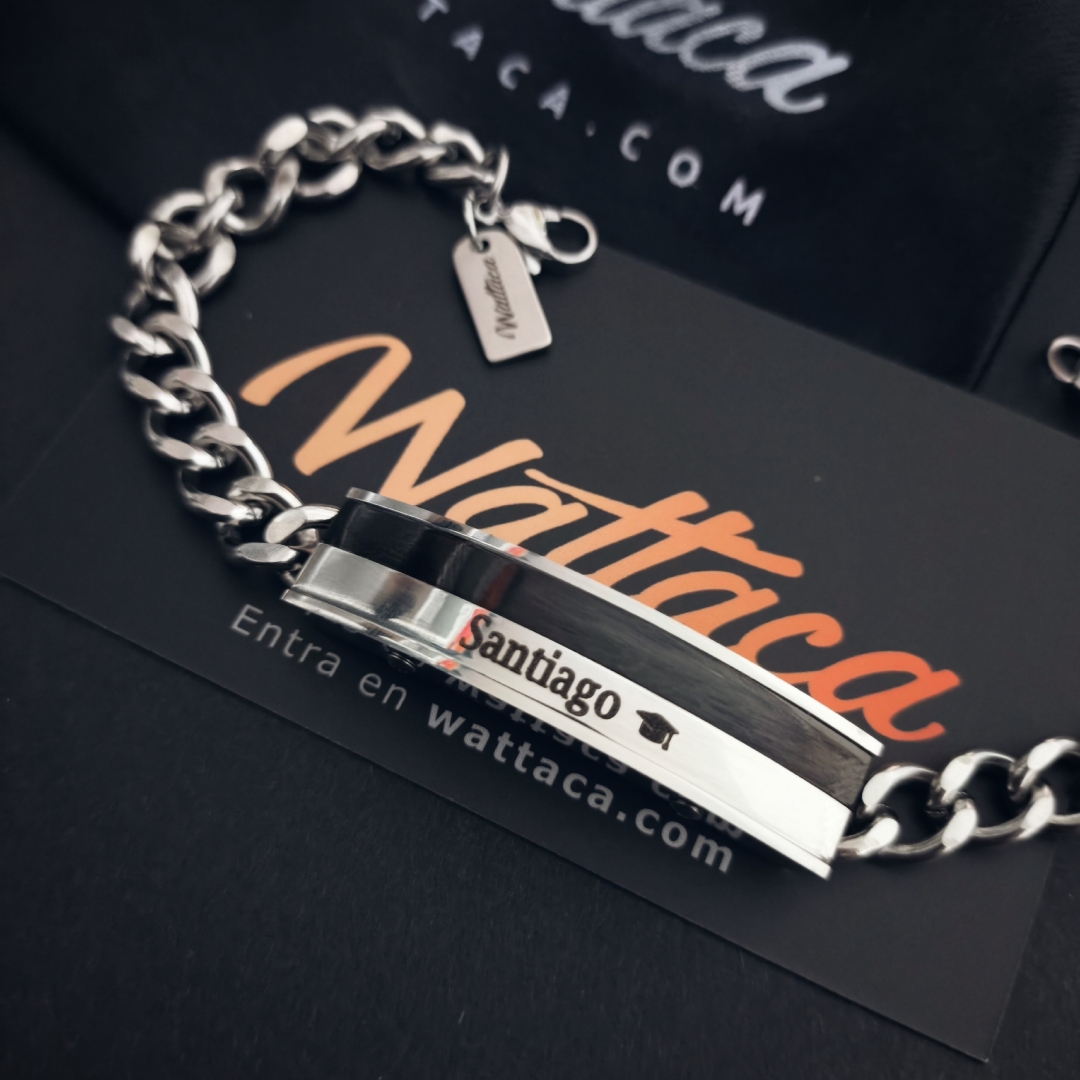 Pulsera esclava para hombre elaborada en acero inoxidable 304 de alta resistencia, con placa central decorada con resina negra y acabado pulido. Su diseño sobrio y masculino permite personalizar con iniciales, nombres o fechas especiales, convirtiéndola en el accesorio perfecto para llevar siempre contigo un mensaje con significado. Ancho de cadena de 7mm y medidas de placa de 45mm x 11mm. Color plateado. No se decolora ni se oxida