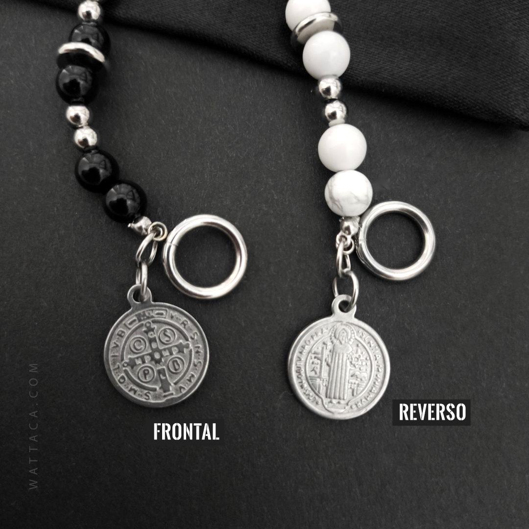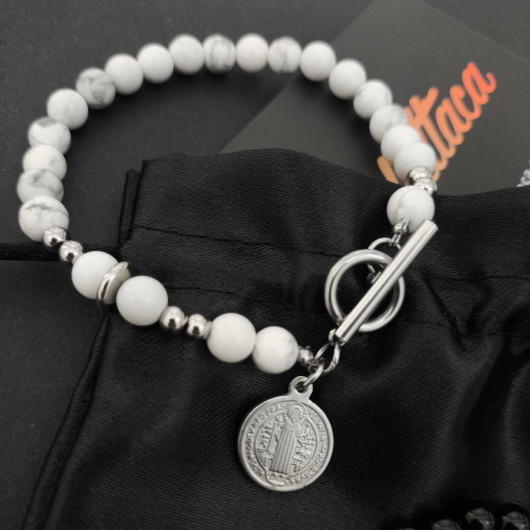 Esta pulsera no solo es un accesorio elegante, también es un símbolo de fe y protección. La medalla de San Benito es conocida por su poder contra el mal y la envidia, un amuleto que muchos llevan para alejar energías negativas y atraer bendiciones. La howlita blanca aporta calma, claridad mental y equilibrio emocional, haciendo de esta pulsera un complemento con propósito.