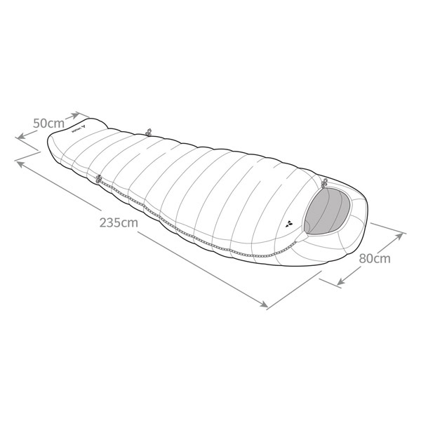 Práctico: el saco de dormir se puede ajustar en pocos pasos en longitud de 25 a 30 cm. El cuello térmico y la capucha se pueden ajustar rápida y fácilmente mediante un sofisticado sistema de cordones; los pies están alojados en una caja para pies 3D ergonómica, acogedora y cálida. El corte está optimizado en cuanto a calor y volumen.