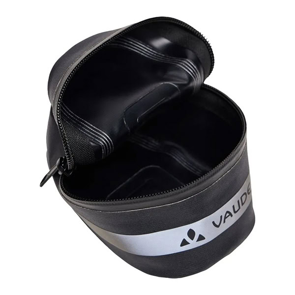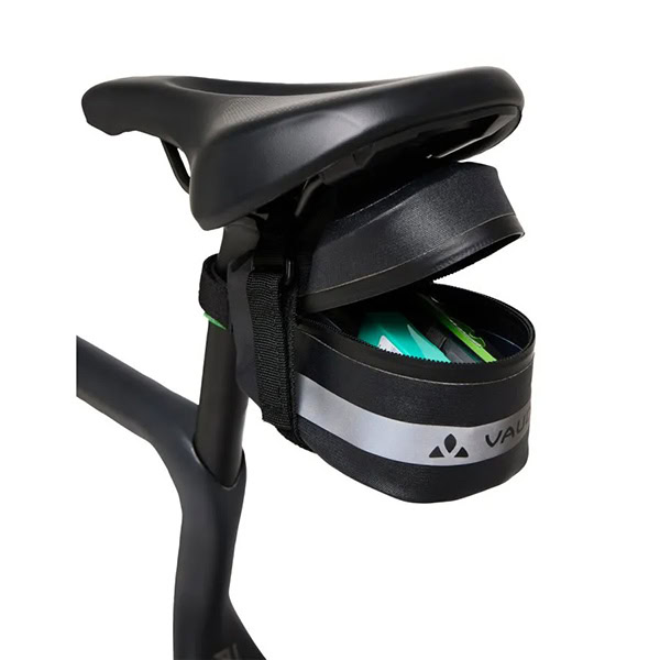 La bolsa para sillín con costuras impermeables Tool Aqua L ofrece a los ciclistas de carreras y sobre grava suficiente espacio para las llaves y las barritas, o bien para herramientas, una minibomba y una cámara de repuesto. La bolsa impermeable para sillín, con cremallera perimetral de amplia apertura que permite un acceso rápido, se instala bajo el sillín de forma sencilla y estable con un sistema de fijación por velcro optimizado. Las cintas y un logo de VAUDE son reflectantes. Además, incluye un lazo para fijar una luz trasera. El distintivo VAUDE Green Shape indica que el producto es funcional, respetuoso con el medioambiente y que está fabricado con materiales sostenibles.