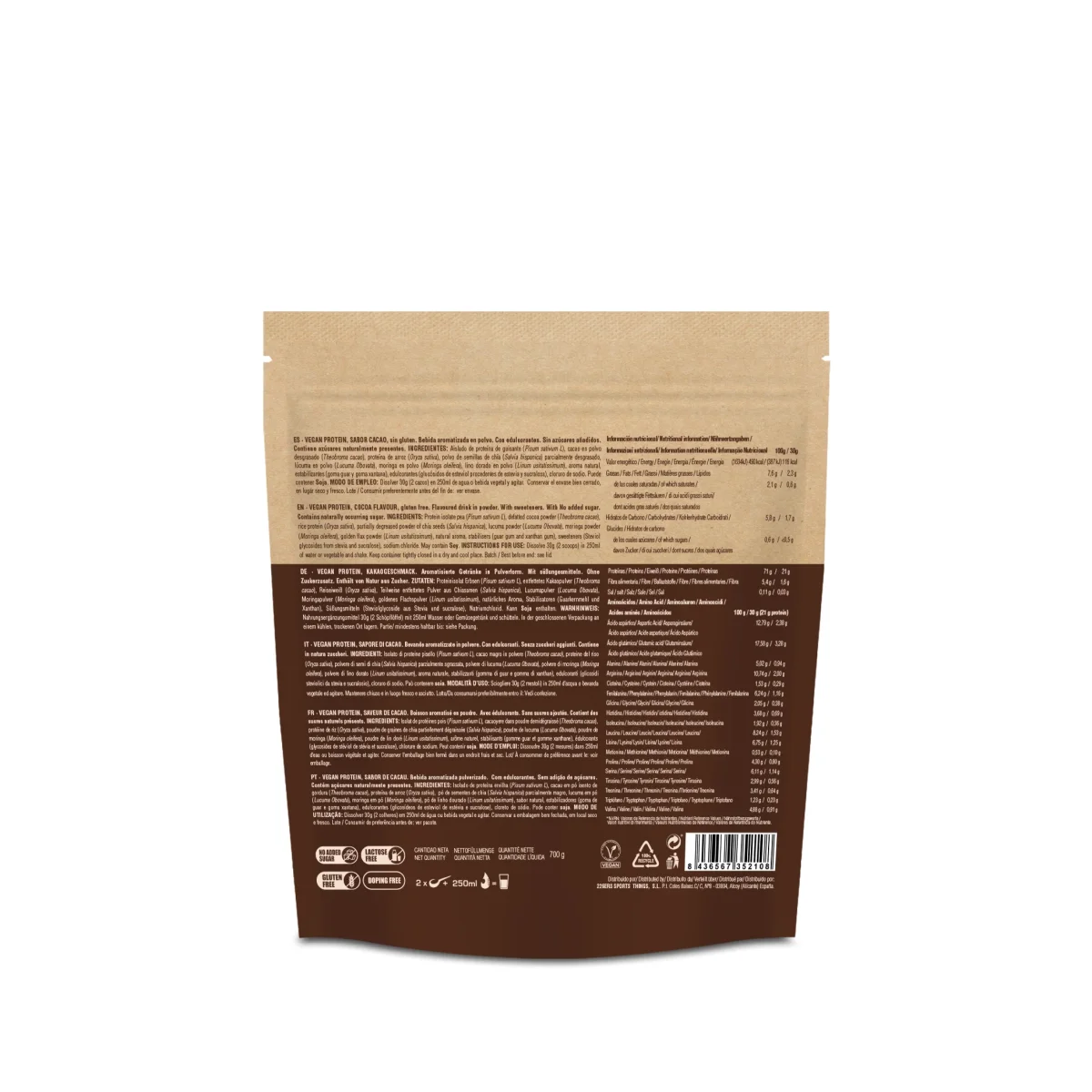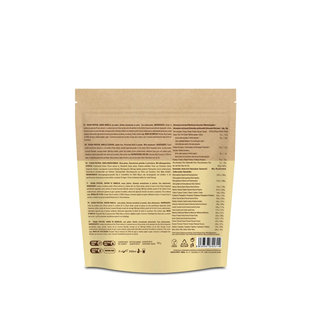 Se trata de un producto apto para veganos con un 70% de proteína, aportando 21g de proteína por toma. Con poco más de 100 kcal, bajo en grasa y sin azúcares añadidos ya que está endulzado con stevia. Su aporte total de azúcar por toma es menor de 0,5 g, por lo que es perfecto para tomar a cualquier hora del día y aumentar la ingesta de proteínas vegetales de manera saludable.