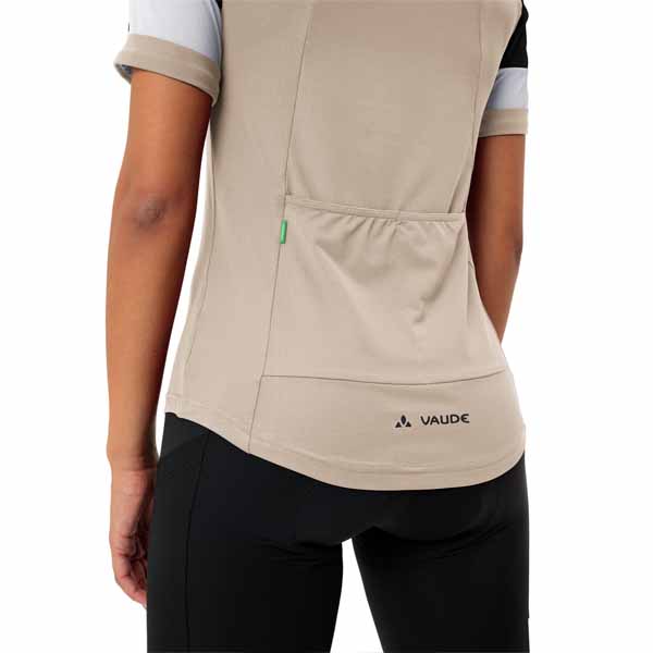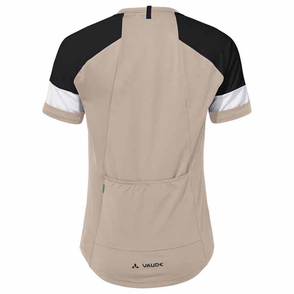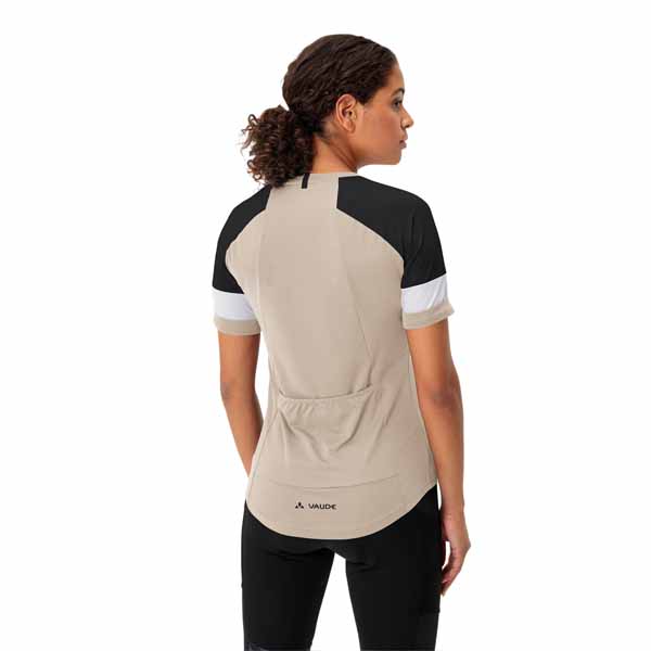 Camiseta multifuncional y con mucho estilo de mujer para ciclismo sobre grava. La camiseta de ciclista Kuro para mujer, con un ajustado corte Slim Fit y cuello redondo, con su estructura híbrida de 2 materiales distintos, predominantemente reciclados, resulta extraordinariamente cómoda: En la zona de los hombros se ha empleado un material muy ligero pero robusto, con ligeras perforaciones. El frontal y la espalda alargada, de un material de punto elástico, son ligeros y de tacto agradable. 2 bolsillos abiertos en la espalda. Destacan los elementos decorativos magníficamente integrados en el diseño de la camiseta de ciclista y los bonitos puños de las mangas. La camiseta Kuro para mujer, de materiales predominantemente reciclados, es una camiseta multifunción ligera, transpirable y de secado rápido para ciclistas ligeras sobre grava y combina extraordinariamente con los pantalones cortos Kuro. El distintivo VAUDE Green Shape indica que el producto es funcional, respetuoso con el medioambiente y fabricado con materiales sostenibles y con certificación bluesign®. Como miembro de alto rango en la organización independiente Fair Wear, VAUDE está comprometida con unas condiciones laborales y unos salarios justos. Además, este producto es climáticamente neutro: las emisiones de los materiales, el proceso de producción y el envío se han calculado integralmente y reducido sistemáticamente. Las emisiones perjudiciales para el clima que actualmente son inevitables se han compensado por completo mediante la organización independiente sin ánimo de lucro «myclimate».