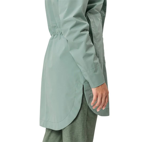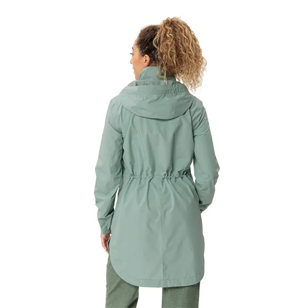 Gabardina moderna y ultraligera para mujeres a las que les gusta recorrer la ciudad a pie o en bicicleta. La parka Mineo, con su material ecológico de 2,5 capas, no solo es absolutamente estanca al agua y transpirable, sino que, además, atrae todas las miradas. Con el ajuste de la cintura, esta gabardina de mujer se ajusta a cualquier figura. Este compacto abrigo chubasquero puede guardarse en su propio bolsillo, convirtiéndose en prenda imprescindible para cualquier viaje. La cremallera invertida permite acceder a los bolsillos del pantalón o subir a la bicicleta sin que se mojen cuando llueve. Y si vuelve a salir el sol, la capucha con ancho ajustable se puede enrollar y guardar fácilmente en el cuello. Un impermeable femenino, moderno, y versátil con un suave tacto de material reciclado con certificado bluesign®, de la que su propietaria disfrutará muchos años. El distintivo VAUDE Green Shape indica que el producto es funcional, respetuoso con el medioambiente y fabricado con materiales sostenibles y con certificación bluesign®.
