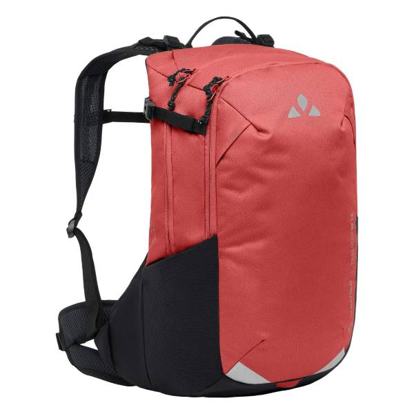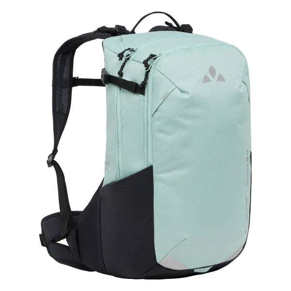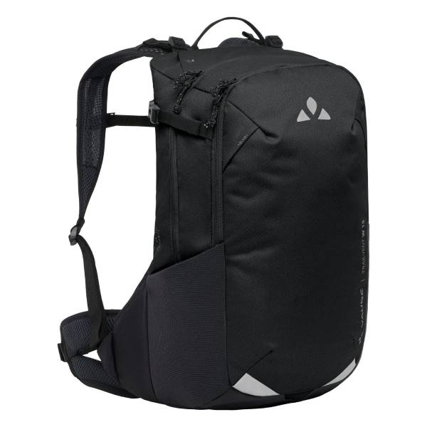 ¡Para salidas espontáneas con la bicicleta de montaña! La mochila de ciclista Trailvent 15 para mujer es ideal. Impresiona por su extraordinario sistema de ventilación Aeroflex 3D en el dorso y, gracias a los tirantes y al cinturón lumbar, bien acolchados, de longitud ajustable y adaptados a la anatomía femenina, además de la correa pectoral con soporte de tubo, ofrecen una comodidad permanente. La compartimentación interior está bien meditada: El gran compartimento principal incluye un compartimento aparte para una bolsa de hidratación, un bolsillo con cremallera para objetos de valor y un portallavero. En el bolsillo delantero se pueden guardar la bomba, herramientas y una cámara de repuesto. Las correas de compresión laterales en el tercio superior sujetan el contenido, mientras que los bolsillos exteriores de malla permiten acceder rápidamente a los objetos necesarios. Un portacasco, un soporte para luz intermitente, grandes elementos reflectantes y una funda impermeable integrada completan el equipamiento. La mochila de ciclista para mujer se ha tratado con Eco Finish, un acabado ecológico que repele el agua, libre de PFC. El distintivo VAUDE Green Shape indica que el producto es funcional, respetuoso con el medioambiente y que está fabricado con materiales sostenibles.